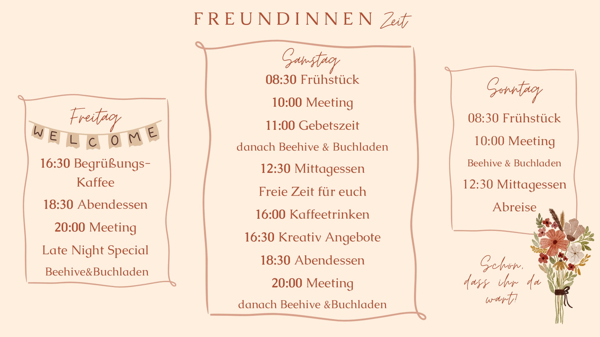 Wir nehmen uns Zeit miteinander in unsere Freundschaften zu investieren. Es gibt Raum für „Quality Time“, gemeinsame Aktionen mit anderen Frauen und Zeit als Freundinnen Jesus zu begegnen.“